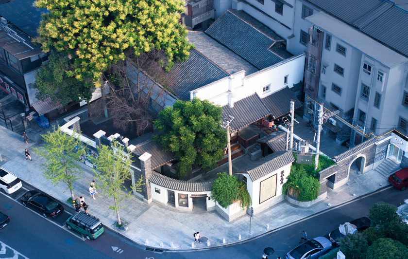 楊建覺:當決策者征詢?nèi)绾翁幹眠@堆磚瓦時,我提議留住一段悠長而即將消逝的歷史場景感也許是不錯的選擇,復建新樓的報批報建也是麻煩,當時心有萌動,念及讀初中時的記憶。我小時候住在大古道巷,時常去一位家住小古道巷的同學家玩。那是一棟老公館,院墻高高、木門厚實、石作講究,進門就是一方天井,接著是精致堂屋,八仙桌、太師椅……妥妥的大宅門感覺。我的設計從盡量留住西側老青磚墻開始,直覺告訴自己正在做一個舞美設計,用寫意方式呈現(xiàn)記憶中的清末民初長沙大宅門。朋友評價說:這是后現(xiàn)代手法,重拾歷史碎片,兼具戲劇化、場景化、情感化特征,功能就是圍繞體驗、拍照、懷古來進行。