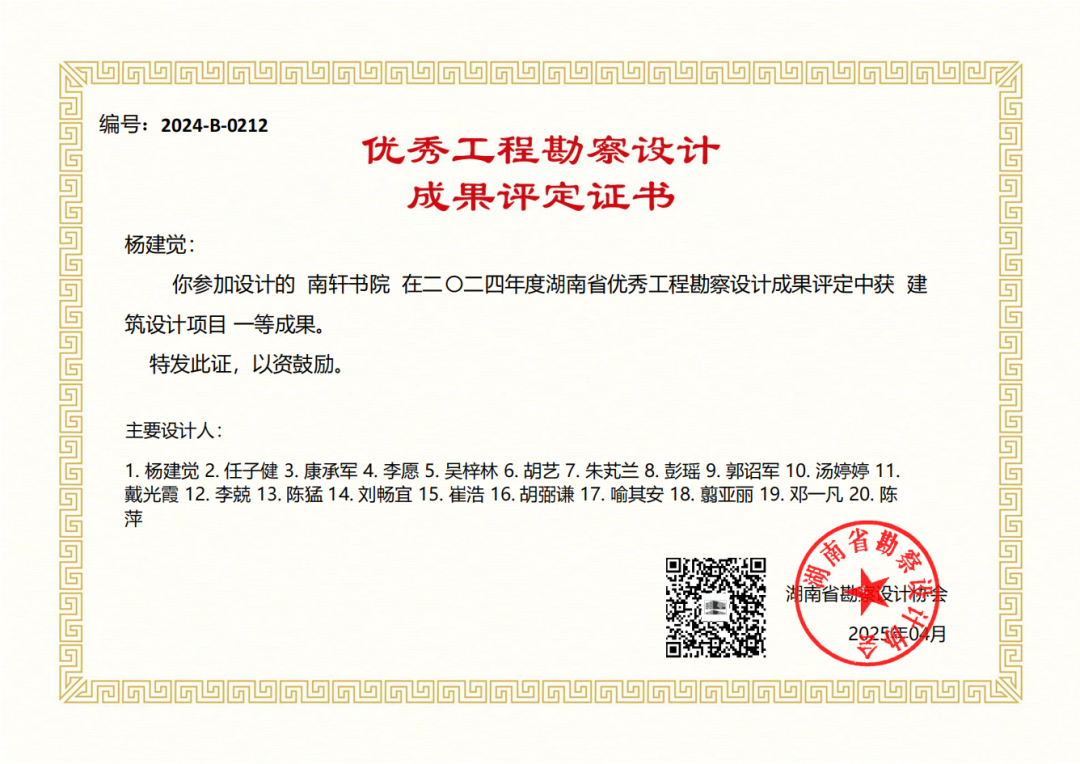青羊湖畔,官山腳下,讓人眼睛一亮的【寧鄉(xiāng)巷子口南軒書(shū)院】,承湖湘文脈、融山水毓秀,古韻今風(fēng),相映成趣,這項(xiàng)由公司設(shè)計(jì)總監(jiān)楊建覺(jué)先生主持的設(shè)計(jì)作品,近期斬獲2024年度湖南省優(yōu)秀工程勘察設(shè)計(jì)一等獎(jiǎng)。