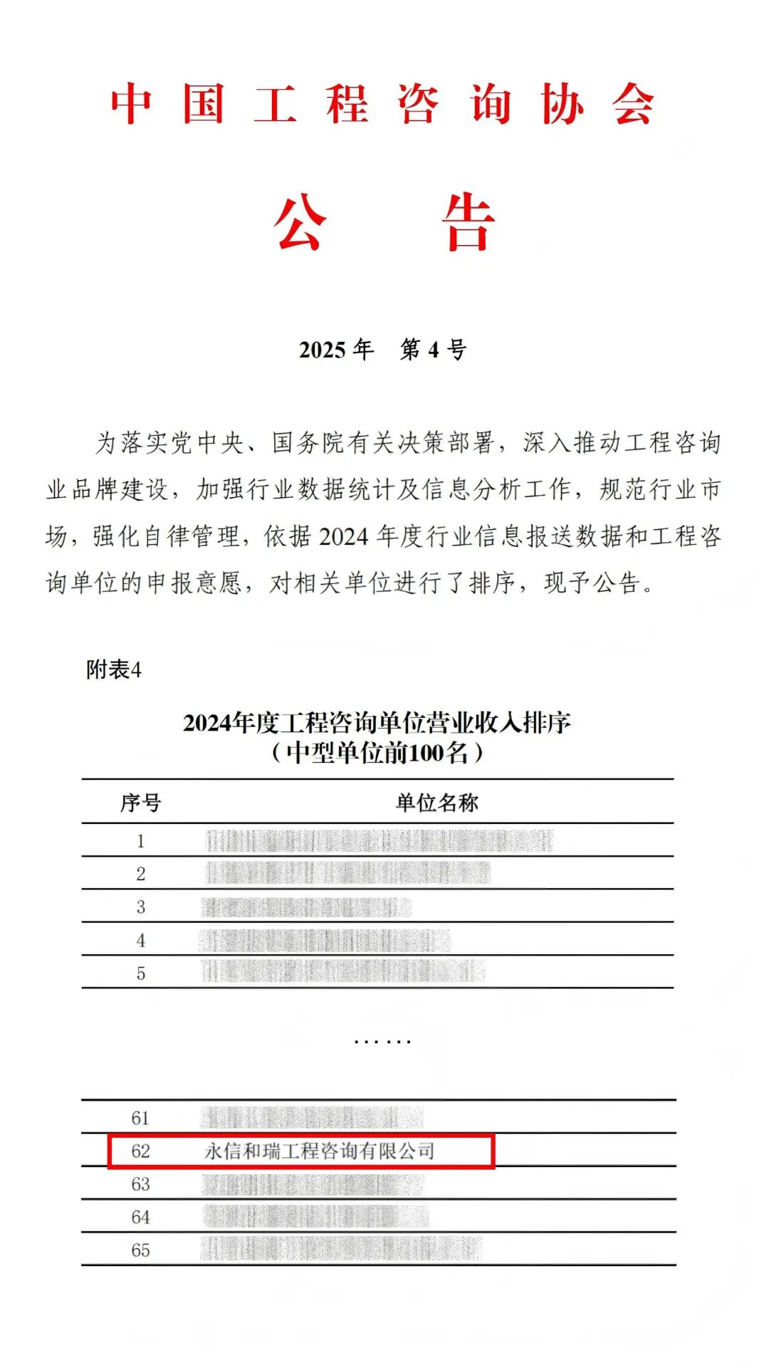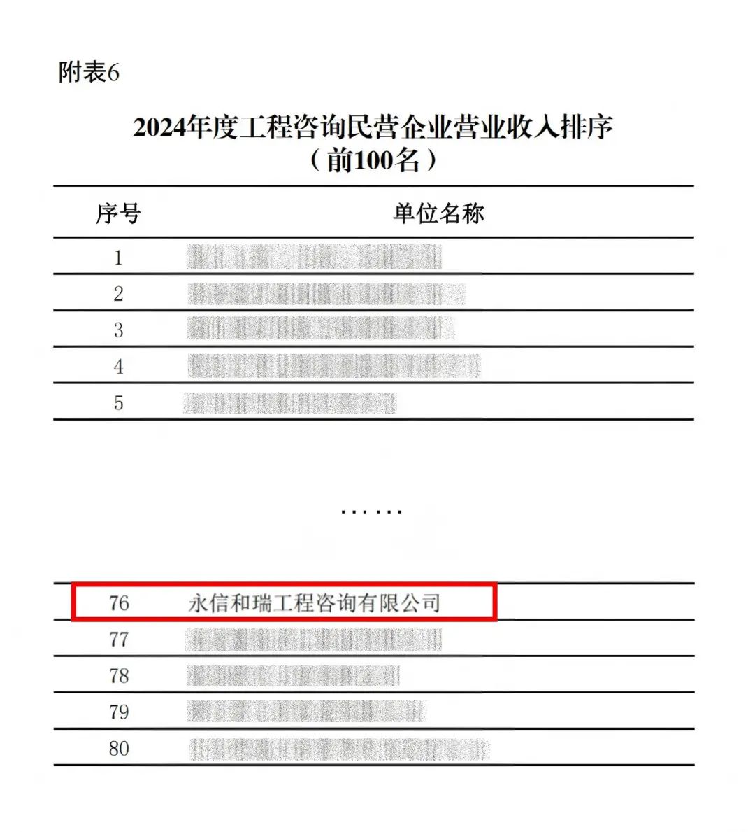 永信和瑞在本次排名中表現(xiàn)突出,位列工程咨詢民營企業(yè)營業(yè)收入100強榜單第76位、中型單位營業(yè)收入100強第62位。