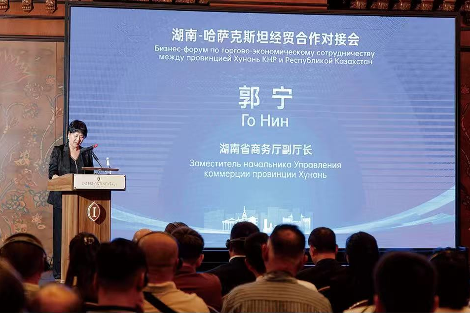 ▲郭寧副廳長(zhǎng)在致辭中介紹,湖南區(qū)位優(yōu)越、產(chǎn)業(yè)基礎(chǔ)扎實(shí)。她強(qiáng)調(diào),哈薩克斯坦是湖南對(duì)外開放合作重點(diǎn)區(qū)域,2024年湘哈進(jìn)出口額達(dá)7.5億美元,同比增長(zhǎng)36.2%。(圖片轉(zhuǎn)載自公眾號(hào)@湖南省對(duì)外經(jīng)濟(jì)合作企業(yè)協(xié)會(huì))