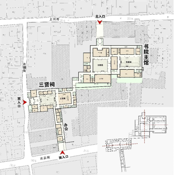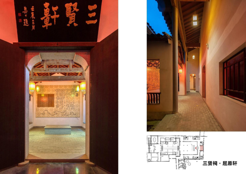 三賢祠以合祀空間為主體,周邊組織屈原軒、賈誼軒、杜甫軒分祀空間。