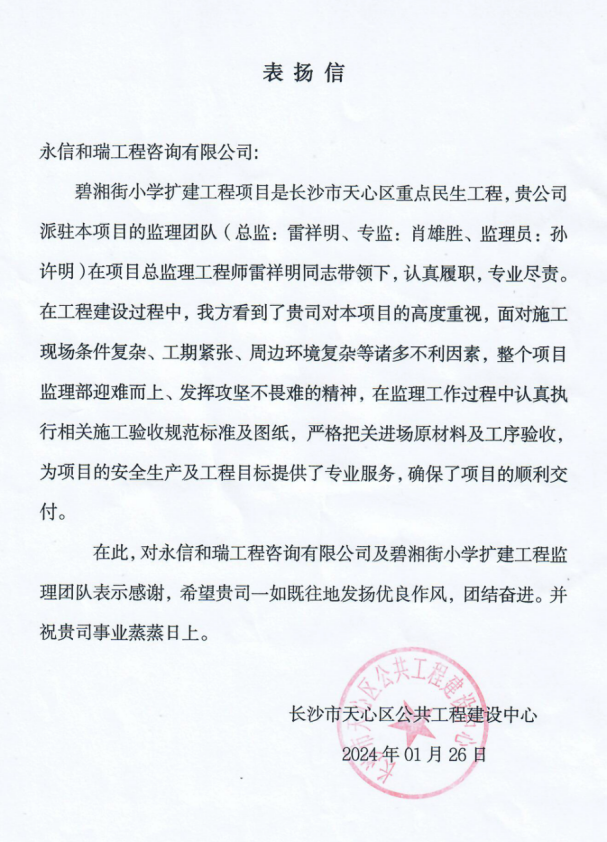 【長(zhǎng)沙訊】2024年1月26日,永信和瑞工程咨詢有限公司(以下簡(jiǎn)稱(chēng)“永信和瑞”)榮獲長(zhǎng)沙市天心區(qū)公共工程建設(shè)中心發(fā)出的表?yè)P(yáng)信,以認(rèn)可公司監(jiān)理團(tuán)隊(duì)在碧湘街小學(xué)擴(kuò)建工程項(xiàng)目中的卓越貢獻(xiàn)。碧湘街小學(xué)擴(kuò)建工程項(xiàng)目作為長(zhǎng)沙市天心區(qū)重點(diǎn)民生工程,對(duì)提升當(dāng)?shù)亟逃O(shè)施具有重要意義。永信和瑞派駐該項(xiàng)目的監(jiān)理團(tuán)隊(duì)(總監(jiān):雷祥明、專(zhuān)監(jiān):肖雄勝、監(jiān)理員:孫許明)在碧湘街小學(xué)擴(kuò)建工程項(xiàng)目工作中提供的專(zhuān)業(yè)服務(wù)獲得了客戶的高度認(rèn)可和好評(píng)。表?yè)P(yáng)信中特別提到,在施工現(xiàn)場(chǎng)遭遇條件復(fù)雜、工期緊張及周邊環(huán)境復(fù)雜等不利因素的情況下,永信和瑞的監(jiān)理團(tuán)隊(duì)迎難而上,發(fā)揮了攻堅(jiān)克難的精神。他們?cè)诒O(jiān)理工作中嚴(yán)格執(zhí)行施工驗(yàn)收規(guī)范標(biāo)準(zhǔn)及圖紙,嚴(yán)格把控了進(jìn)場(chǎng)原材料及工序驗(yàn)收,為項(xiàng)目的安全生產(chǎn)及最終目標(biāo)的實(shí)現(xiàn)提供了專(zhuān)業(yè)可靠的服務(wù),確保了項(xiàng)目的順利交付。長(zhǎng)沙市天心區(qū)公共工程建設(shè)中心表示,感謝永信和瑞及其監(jiān)理團(tuán)隊(duì)對(duì)碧湘街小學(xué)擴(kuò)建工程的辛勤工作和專(zhuān)業(yè)貢獻(xiàn),并鼓勵(lì)公司繼續(xù)發(fā)揚(yáng)團(tuán)結(jié)奮進(jìn)的優(yōu)良作風(fēng),共同為社會(huì)和民生事業(yè)作出更大的貢獻(xiàn)。