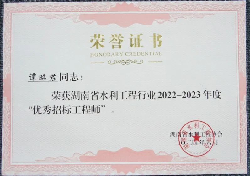 7月8日,在水利工程事業的浩瀚藍圖中,我們迎來了一個榮耀的時刻:永信和瑞榮獲湖南省水利工程行業2022-2023年度優秀企業,我司的譚昭君同志榮獲湖南省水利工程行業2022 -2023年度“優秀招標工程師”。這份雙重的榮譽,是來自湖南省水利工程協會的肯定,增強了我們在水利工程方向發展的信心。